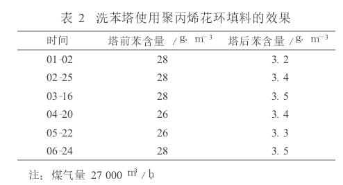 洗苯效果的好壞,關(guān)鍵取決于洗苯塔的結(jié)構(gòu)和塔內(nèi)填料,因此選用合適的填料可以提高煤氣中粗苯的回收率,降低生產(chǎn)成本,保證裝置長周期運行。